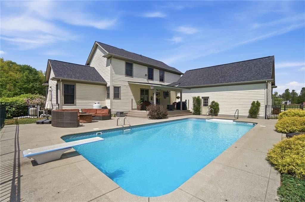 Gorgeous custom home on 2 acres in Clinton-Massie Schools! 2560 sq ft two story, 2.5 baths, 4 bedrooms that include a first floor primary en suite with walk in closet, vaulted ceiling, double vanity, shower and soaking tub. Fully remodeled kitchen (2017) is open to family room, has SS appliances, granite counters, island w/oven/range & microwave, tall cabinetry, quick access to mud room/entry beverage center & bar. Family room w/built in bookshelves, gas fireplace, & walkout to salt water in ground pool! The pool area is well designed w/covered patio/deck perfect for watching tv or morning coffee, plus concrete pool deck is ample enough...read more